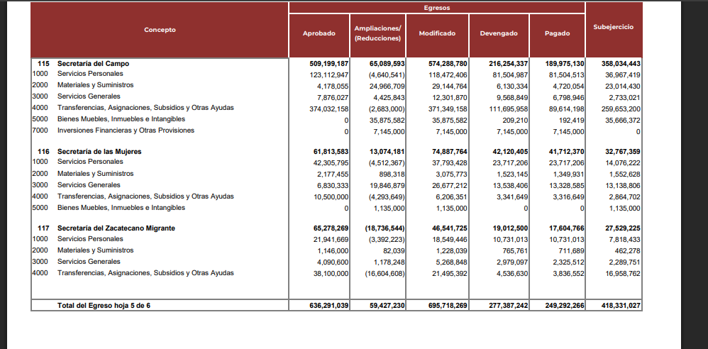 Al respecto, es indignante que, según los Informes Financieros del Ejecutivo —en el Estado Analítico del Presupuesto de Egresos, Clasificación Administrativa y Clasificación por Objeto del Gasto al tercer trimestre de 2025— dependencias como Secampo hayan retenido más de la mitad de su presupuesto en el capítulo 4000 (Transferencias, Asignaciones, Subsidios y Otras Ayudas). Se destinaron 374 millones 032 mil 158 pesos a ese rubro, monto que se redujo poco más de 2 millones, quedando en 371 millones 349 mil 158 pesos.