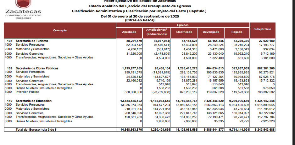 Si bien, siendo estrictos, se llama subejercicio al recurso no ejercido al final del año fiscal, el hecho de dejar el dinero público en los bancos y no asignarlo trimestralmente también afecta a los zacatecanos. La economía se paraliza si se guarda el dinero en lugar de promover obra pública. Así ocurre con la Secretaría de Obras Públicas, que de los 850 millones de pesos presupuestados a inversión pública, solo ha pagado 119 millones 523 mil 338 pesos. Y de ahí “pal real”.