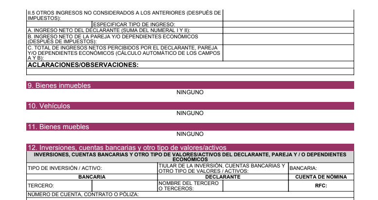 Para la última declaración negó bienes muebles, inmuebles ni vehículos. Solo declaró una deuda de 40,828 pesos en una tarjeta de crédito y omitió el saldo insoluto del crédito hipotecario. Declaró nulos conflictos de interés.