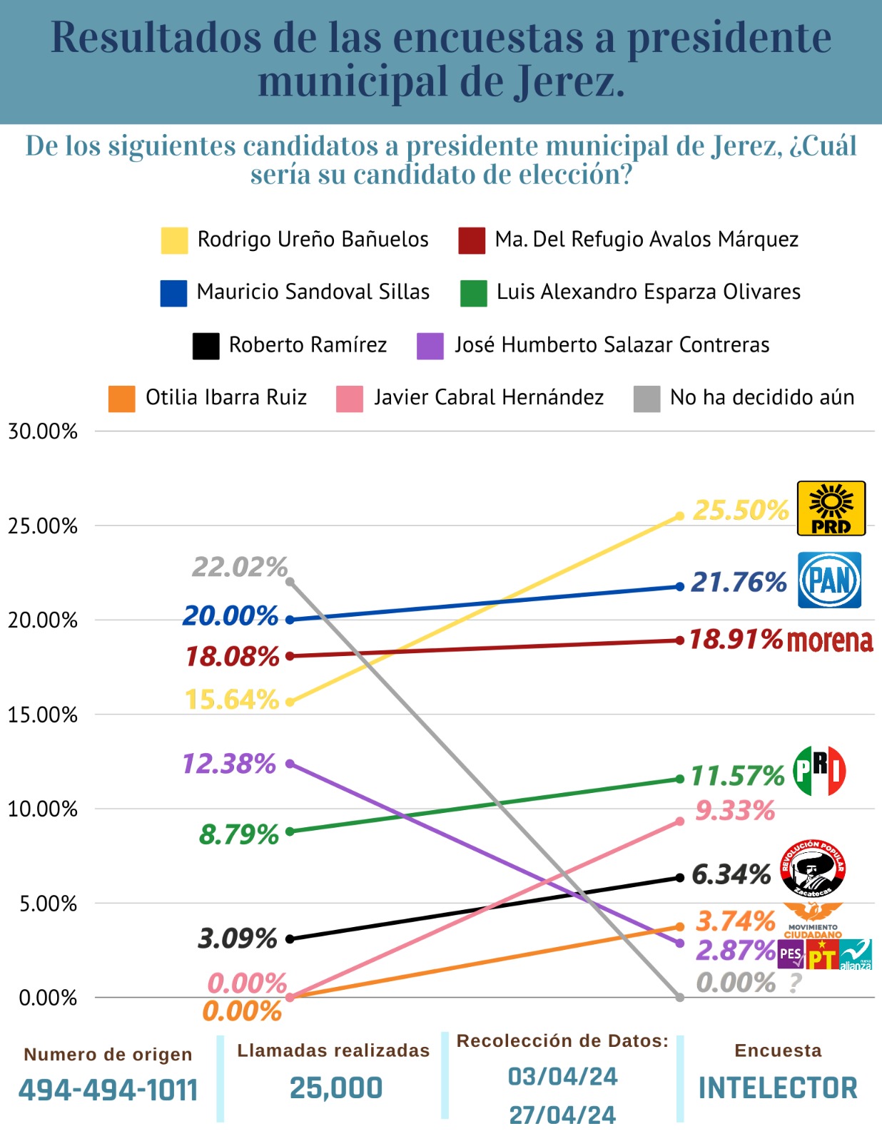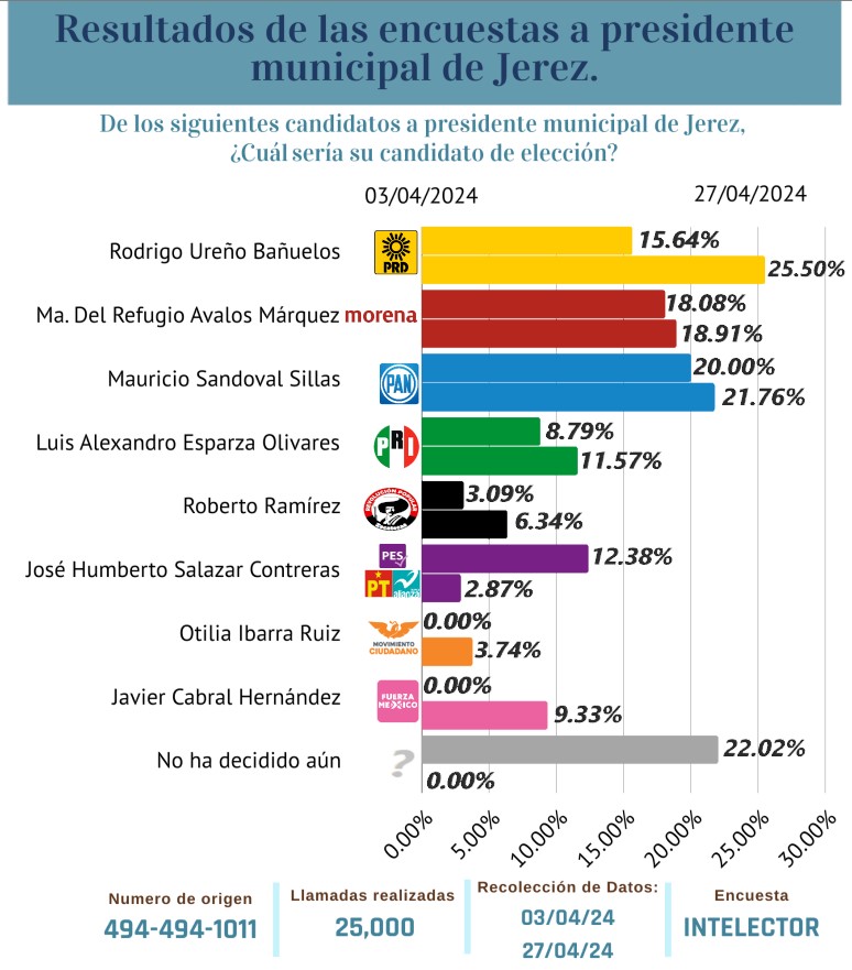 El candidato del PRD ¿Caballo que alcanza? .- Una encuesta levantada el 27 de abril a través de 25 mil llamadas telefónicas, realizadas presuntamente por Intelector, daría la ventaja a Rodrigo Ureño, en la carrera por la alcaldía de Jerez.  Según la medición mencionada,  el candidato del PRD aventaja a su más cercano competidor Mauricio Sandoval del PAN, con 3.7 puntos porcentuales.   La empresa plantea: De los siguientes candidatos a presidente municipal ¿Cuál sería el candidato de su elección? Las respuestas son variopintas, por la múltiple oferta electoral, sin embargo la tendencia a favor del candidato perredista, comienza a ser evidente. De ahí que Ureño Bañuelos  haya obtenido el 25.50 por ciento de las preferencias, mientras su contrincante más cercano, Mauricio Sandoval,  logró que 21.7 de los habitantes de ese municipio lo eligieran. En tercer sitio se ubicó a María del Refugio Ávalos Márquez a quien la prefirieron 18.9 por ciento de los jerezanos. En el análisis, el cuarto favorito es el priista y ex diputado Luis Alexandro Esparza, cuyo nombre respondieron 11.5 de los encuestados. La muestra incluyó todavía al doctor Humberto Salazar Contreras que obtuvo 2.8 por ciento de las preferencias luego de dimitir por “problemas de salud” como pretextó el galeno.